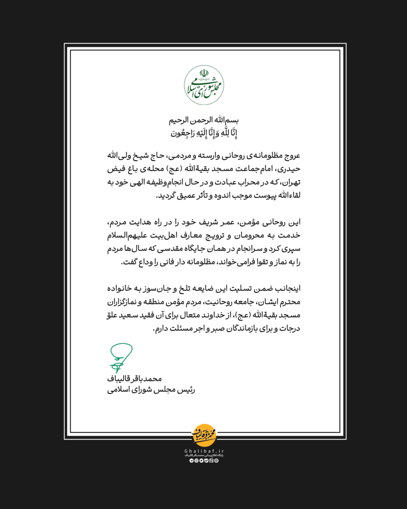رئیس مجلس در پیامی، عروج مظلومانه امامجماعت محلهٔ باغ فیض را تسلیت گفت
