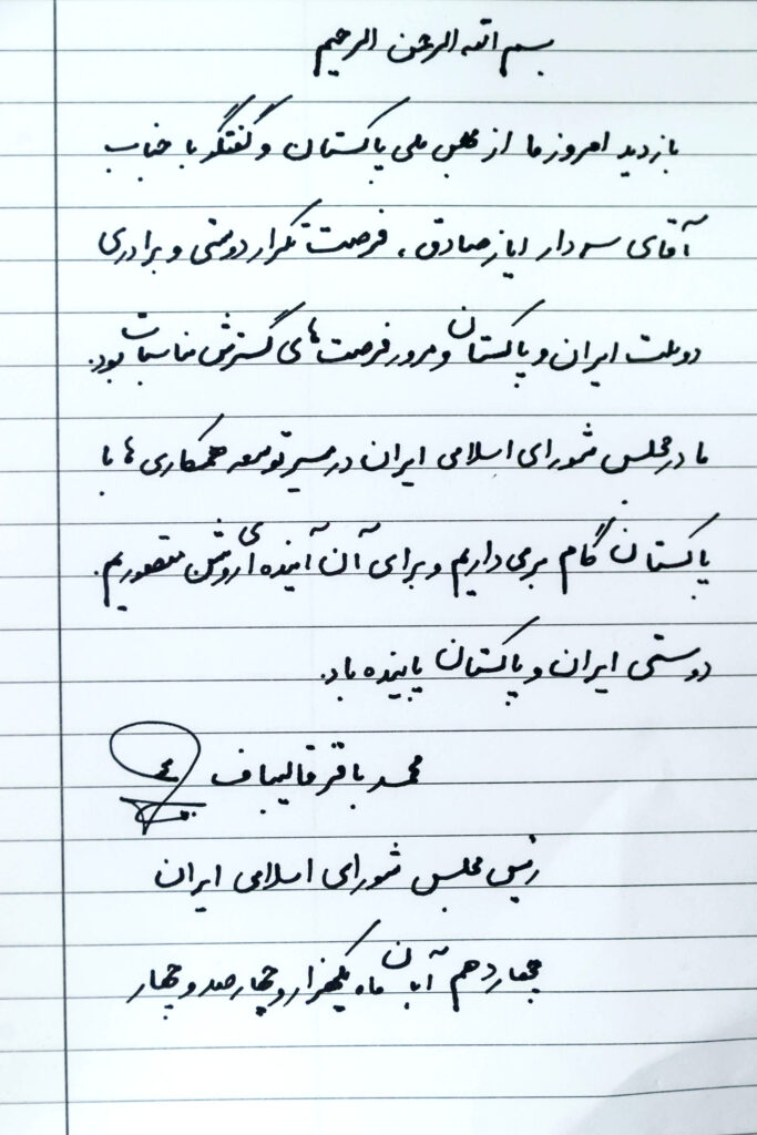 محمدباقر قالیباف رئیس مجلس شورای اسلامی که برای انجام یک سفر رسمی سه روزه راهی پاکستان شده است، با «ایاز صادق» رئیس مجلس ملی پاکستان در اسلام آباد دیدار کرد.