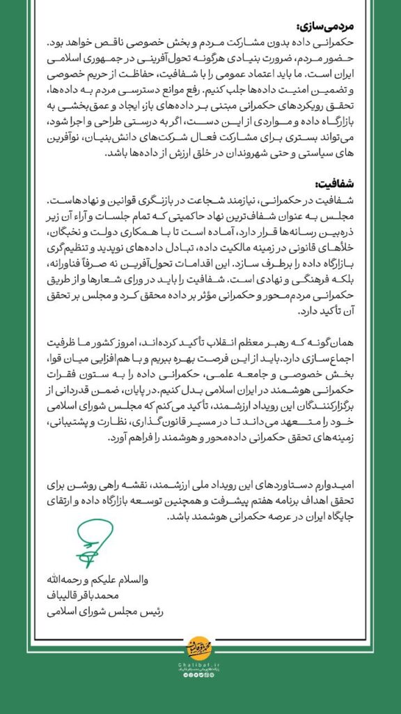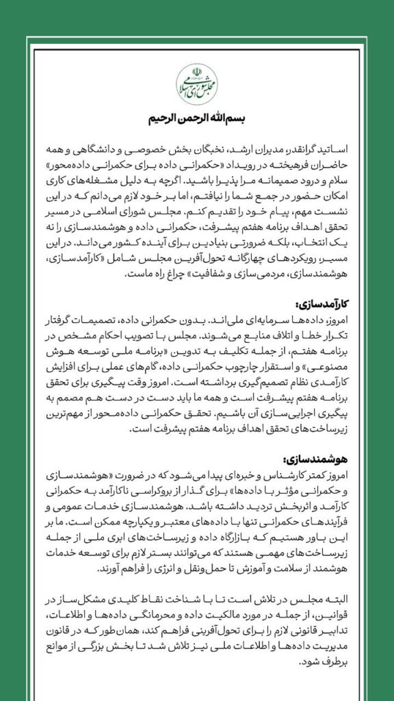 پیام رئیس مجلس به رویدار ملی حکمرانی داده برای حکمرانی دادهمحور