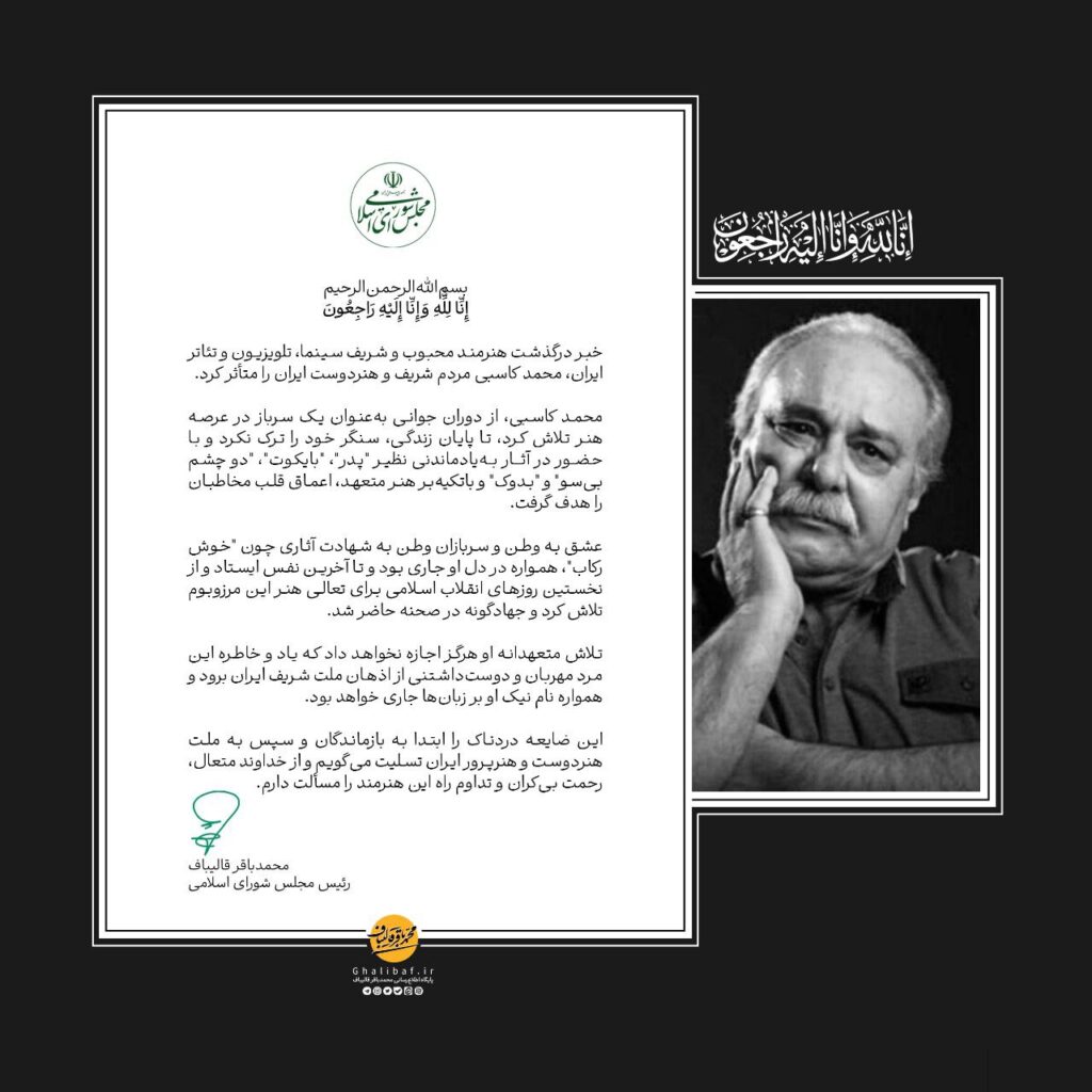 رئیس مجلس شورای اسلامی با صدور پیامی درگذشت محمد کاسبی، هنرمند سینما، تئاتر و تلویزیون را که بعد از گذران دوره‌ای بیماری دار فانی را وداع گفت، به بازماندگان، اهالی هنر و ملت هنردوست ایران تسلیت گفت.